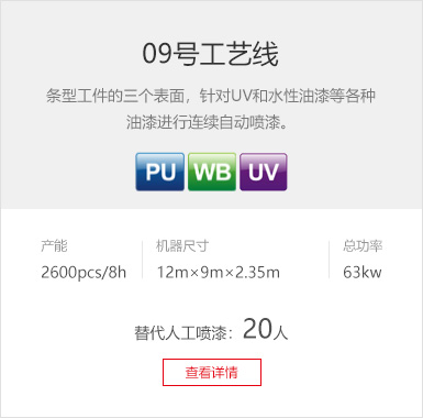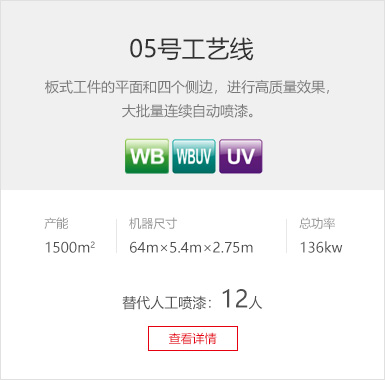 工藝要求 UV底漆、水性色漆、水性LED-UV面漆 產(chǎn)品種類 膜壓PVC櫥柜門板、定制衣柜、線條 產(chǎn)線數(shù)量 4條 設(shè)備特色 LED-UV固化系統(tǒng)、立體干燥房配1臺,待干45分鐘 生產(chǎn)產(chǎn)能 UV底漆噴涂線:1800m2/8h ( 生產(chǎn)員3人/線)
